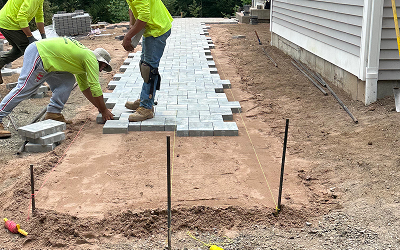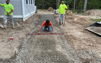 We evaluate the existing grades, determine the drainage needs; then excavate, install base stone, and add drainage pipes as needed for a long lasting foundation
